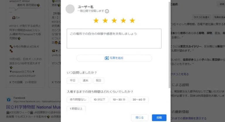 クチコミを書くポップアップが表示されますので、必要事項を入力したり質問に答え、その後「投稿」をクリックします。
