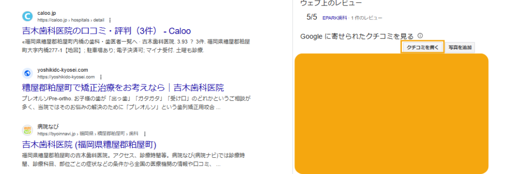 または、ビジネスプロフィールの「Googleのクチコミ(○○件)」をクリックするとレビューの一覧が表示されます。その右上の「クチコミを書く」ボタンをクリックすると、同じように投稿記入画面に進むことができます。